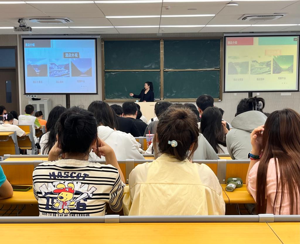 庐山嘉豪淮海国际豪生酒店坐落于庐山风景区,是庐山上的高端度假型酒店。酒店前厅销售部经理王丹蕾通过照片及视频资料带领大家感受了酒店内部设施及外观环境,展示了酒店近年来承办的大型接待活动;酒店人力资源部经理彭秀英对于酒店招聘岗位、薪酬待遇、发展路径等方面进行了全面介绍。在随后的答疑环节中,酒店方与同学们开展了亲切互动,现场有19名同学投递了简历,达成了初步就业意向。