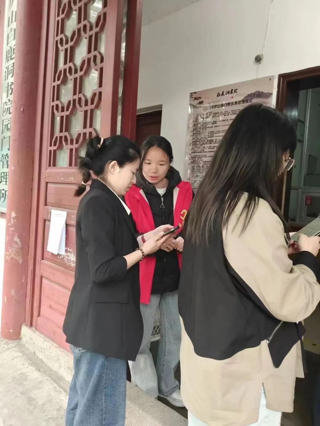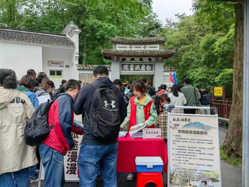 志愿者们各有分工,以饱满的热情投入志愿服务当中:有的在售票处为游客提供详细的购票指引,解答游客们的疑虑;有的维持景区秩序,提醒广大游客爱护环境、避免拥挤;有的在书院内的巾帼志愿服务岗上,为游客们提供导览服务,热情地向游客们讲述白鹿洞书院的历史文化知识,让游客们在游览过程中领略传统文化的魅力。