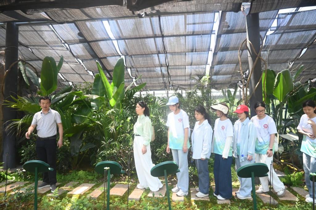 随后,实践队走进九江市庐山茶叶科学研究所,深入调研庐山云雾茶产业的现代化发展路径。在研究所负责人的带领下,队员们参观了科技创新馆、育苗基地和加工车间。在科技创新馆内,展示着近年来在智能化制茶、绿色防控、有机栽培等领域取得的技术突破。技术人员现场演示了利用现代信息技术对茶园生态环境进行数字化管理与实时监控技术,展现出传统茶产业与前沿科技的深度融合。在茶叶加工车间,讲解员详细介绍了茶叶从种植、采摘到加工、包装等完整的制作流程。最后,实践队参观了茶研温室、母本园和育苗园,这里汇集了国内外众多优质的茶树品种,以及本地科研人员自主培育的新品种。“原来一片茶叶的背后有这么多科技含量!”一名队员表示,此次参观让大家对“三茶统筹”发展理念有了更加深入的理解。传统与现代的结合,正是茶产业可持续发展的关键,实践队员们深切感受到科技创新正在为茶产业发展注入强劲动力。