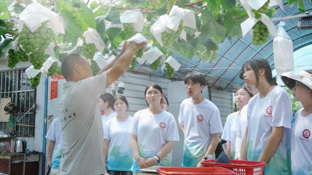 实践队员们来到位于海会镇彭山村的三叠泉葡萄园,2018年,退役军人张明伟响应国家号召,自主择业后大胆投身葡萄种植。尽管面临气候、土质条件不适等诸多难题,他坚持“不求产量、只重品质”,通过精准控产、精细修剪,保障葡萄品质。此地种植的阳光玫瑰自培育以来便得到各级政府的大力支持,不仅为当地的村民提供大量就业岗位,还带动附近罗家山,高垅碧龙潭,五星村等5个种植基地共同发展。面对同学们的热情提问,张明伟现场展示了葡萄修剪技术,他满怀憧憬地谈到:“将来我还要继续试种优良品种,做到人无我有,人有我优,带动更多乡亲共同致富”。