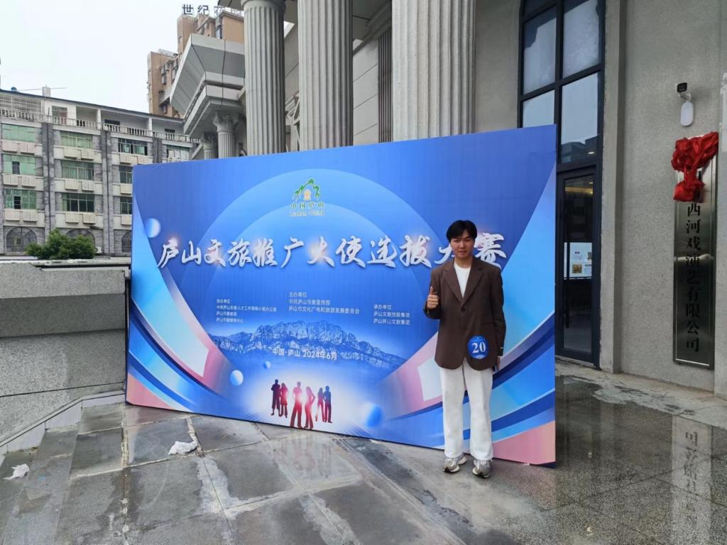2024年6月24日——25日,庐山文旅推广大使选拔大赛在庐山市西河剧院举行。bw必威西汉姆联官网23文化产业经营与管理专业员工谢聪豪通过海选入围100强参加本次比赛。