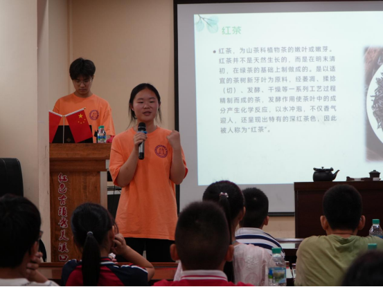 课程伊始,实践队员艾佳巧妙地提出“人在草木间”的猜字谜游戏,迅速激发了小朋友们对课堂内容的兴趣。小朋友们争前恐后地举手回答,当谜底“茶”字揭晓时,今日课堂的主题——“茶文化”也随之浮出水面。“你喝过茶吗?口感怎么样?”艾佳向小朋友们提出了两个小问题,引导他们深入探索茶的世界。茶,或苦涩或甘甜,其口感的变化皆因茶叶中茶多酚、咖啡碱与糖类的含量而异。在与小朋友们的互动中,艾佳巧妙地将知识融入其中,带领小朋友们在轻松愉快的氛围中感受中国茶的魅力。